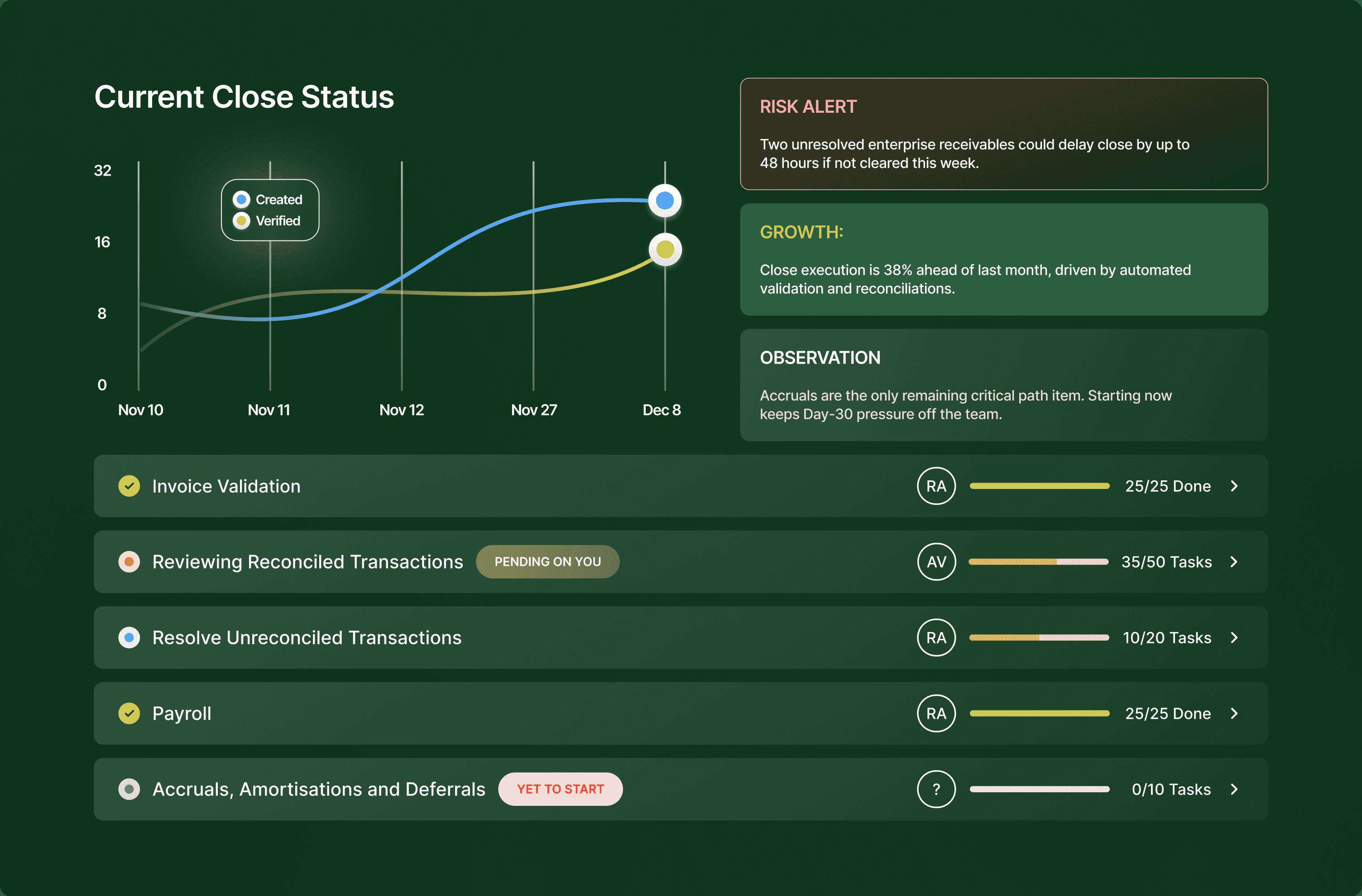 Track close progress and variances in real time. See what's done, what's blocking, and changes with full context.