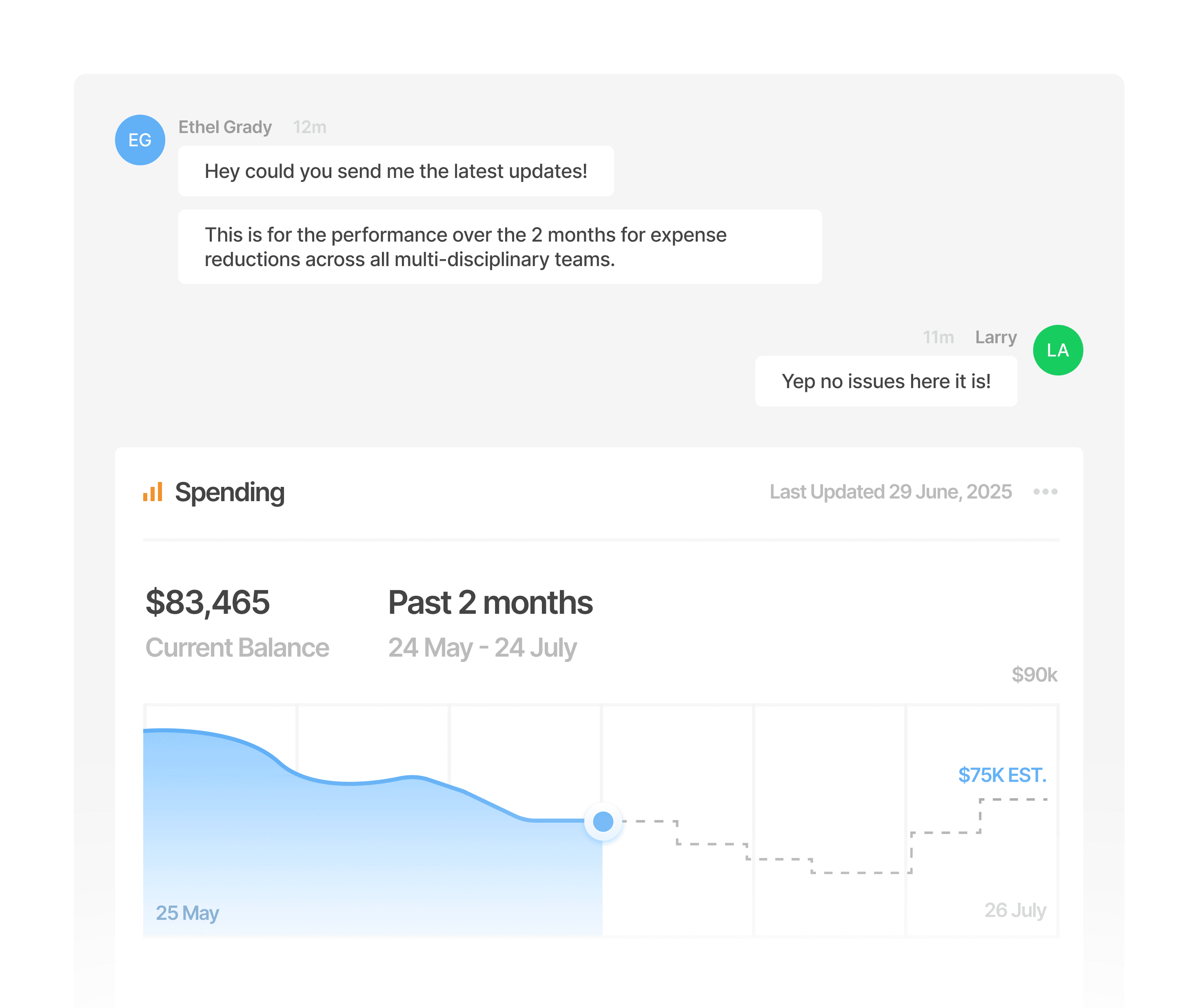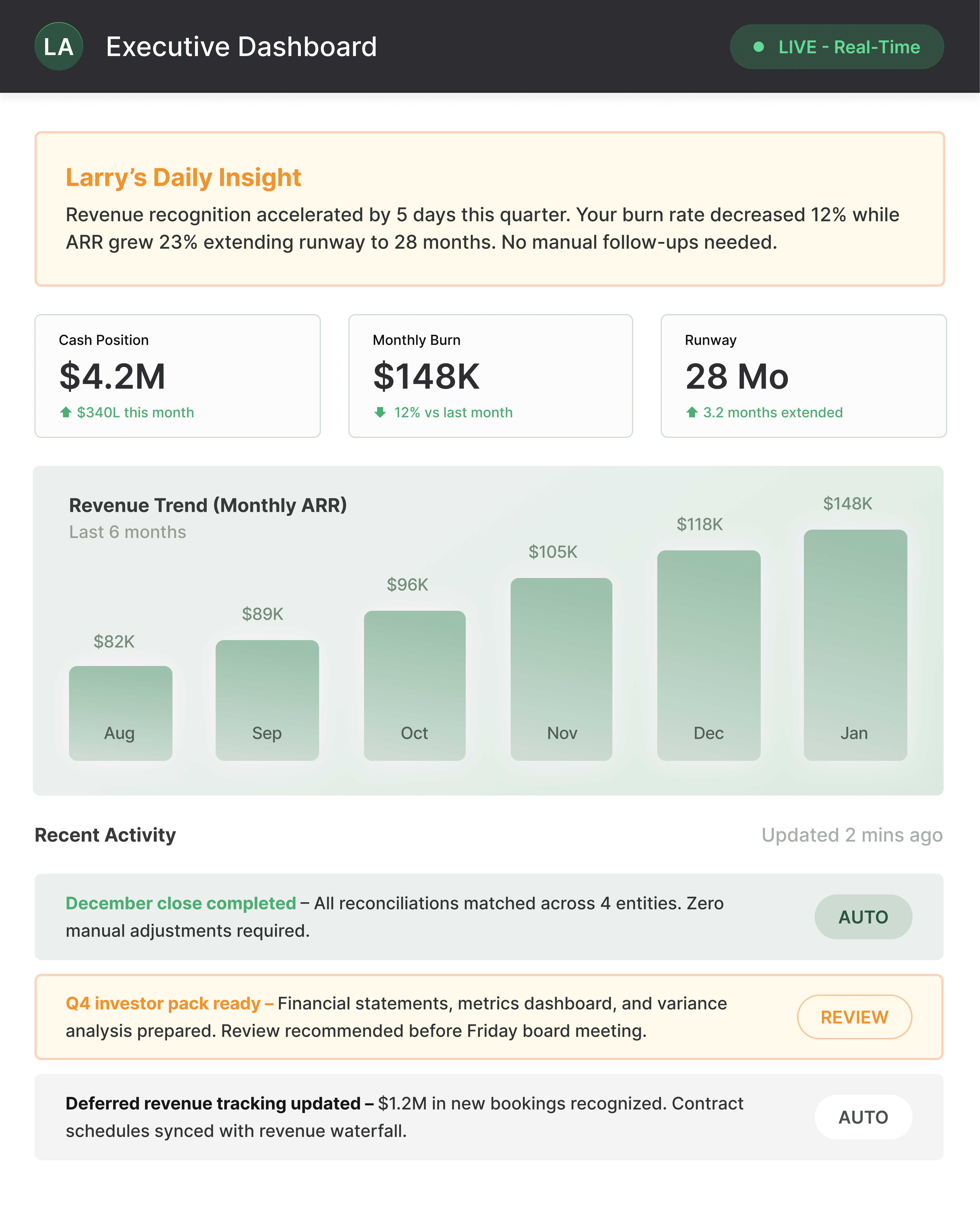 See financial metrics in real-time, not 10 days after close. Larry turns accounting activity into executive answers - so you make hiring and spending decisions based on current data, not stale reports.