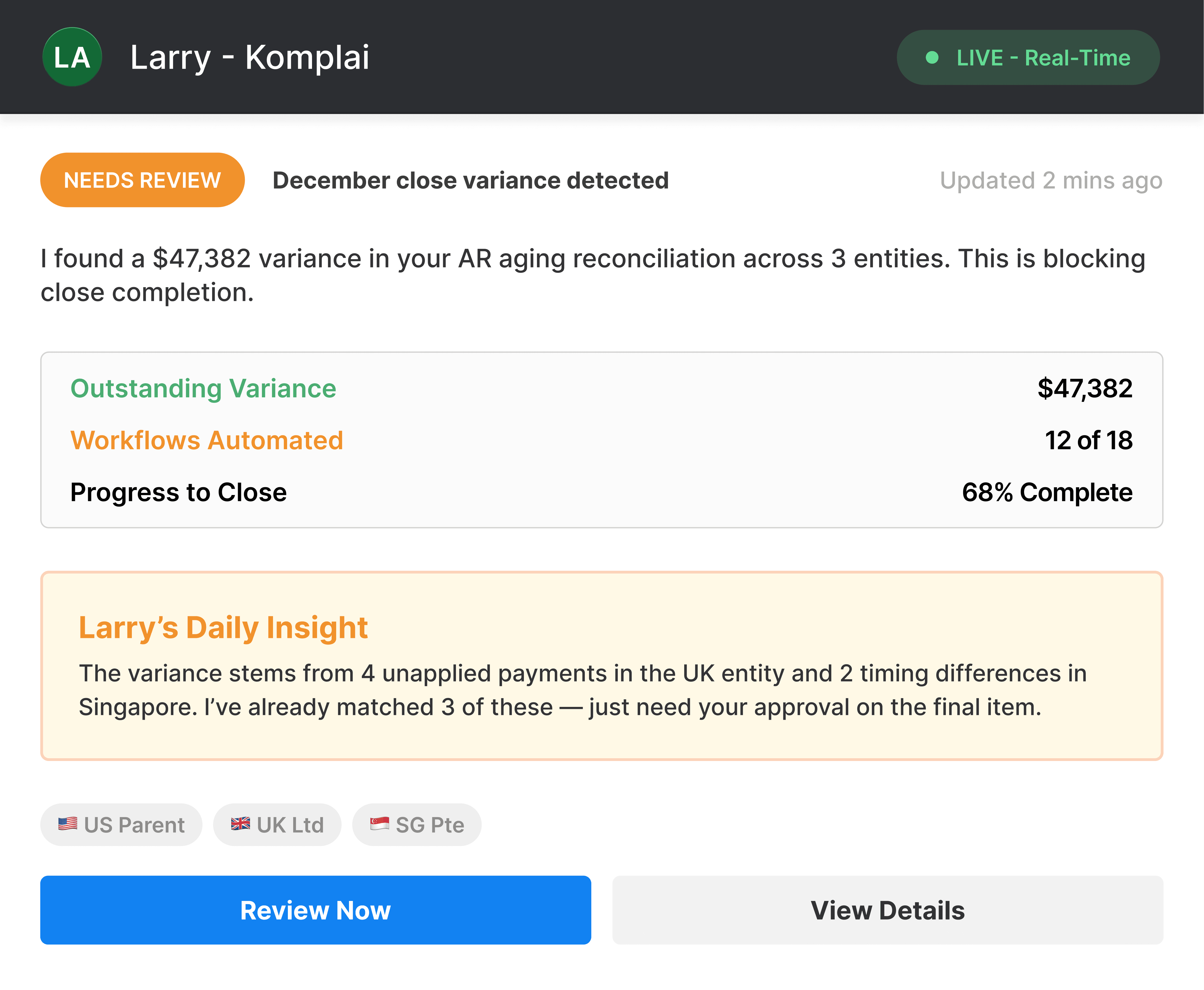 See close progress, reconciliations, and variance drivers in real time. Larry handles follow-ups automatically so board meetings start with answers, not “we’ll look into it.”
