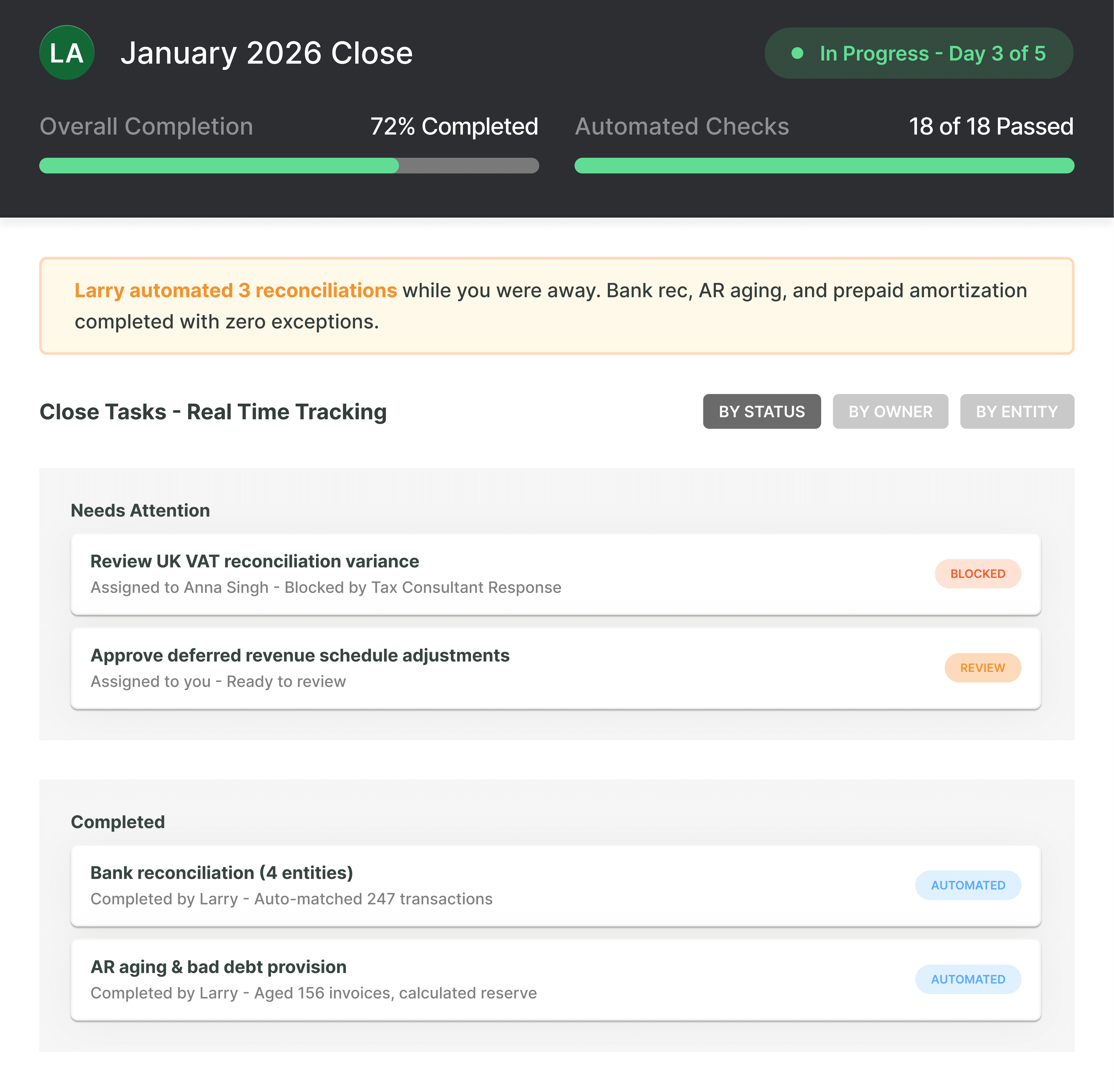 Monitor close status by task, owner, and account in real time. Larry automates routine work and surfaces only exceptions with audit trails attached.